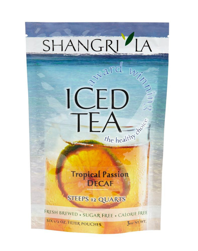 Shangri La Tropical Passion Decaf Iced Tea Packets 6ct bag contains six filters that can brew approximately two quarts of tropical fruit flavored decaffeinated black iced tea. This Shangri La fruity iced tea is blended with tropical fruit, flowers, and quality black teas for the perfect flavor. Enjoy the robust flavor of this decaffeinated iced tea while relaxing after a long day. Purchase a six count bag of Shangri La fruity Tropical Passion Decaffeinated Iced Tea at CoffeeForLess.com, your shop for Shangri La decaffeinated iced teas.